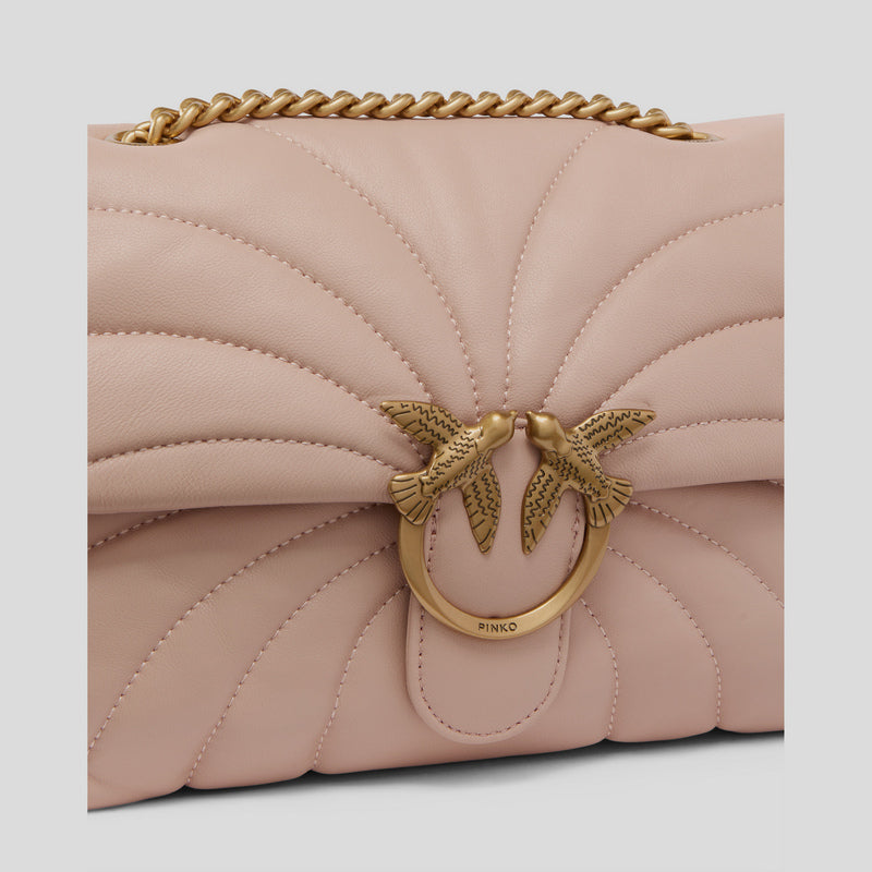 Bolso Bandolera LOVE PUFF CLASSIC CL SHEEP de PINKO realizado en napa suave de oveja con MAXIACOLCHADO en forma de MARIPOSA color NUDE. Cierre con hebilla emblemática Love Birds Diamond Cut DORADA. Interior en microfibra, panel divisorio con cremallera.