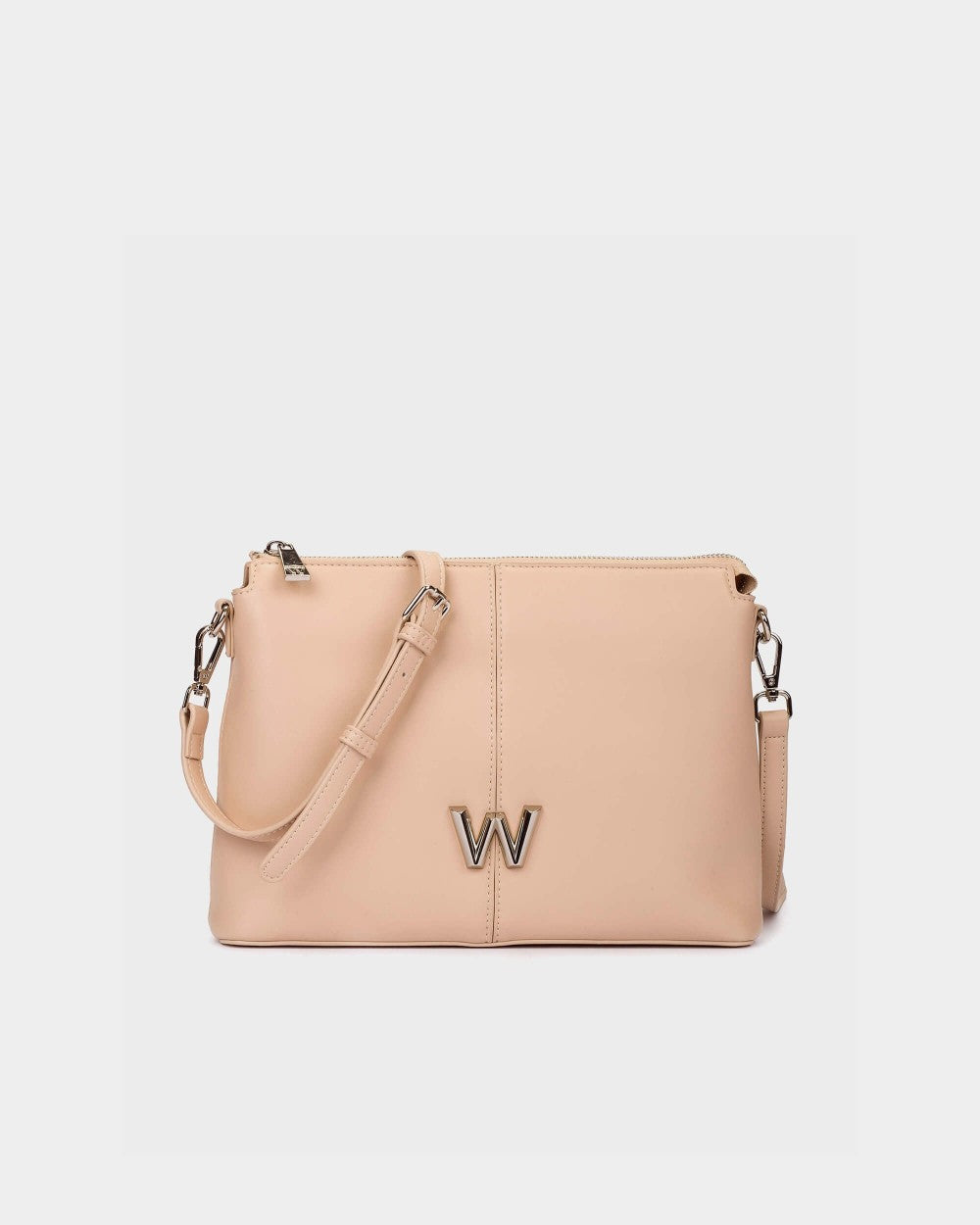 Bolso bandolera mediano SACHI en color BEIGE forma rectangular con cierre de cremalleras y bandolera ajustable. Exterior en piel sintética con detalle de logo metálico e interior en algodón con triple compartimento.Tamaño:28(largo)/21 (alto)/5(fondo)