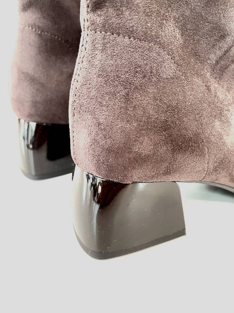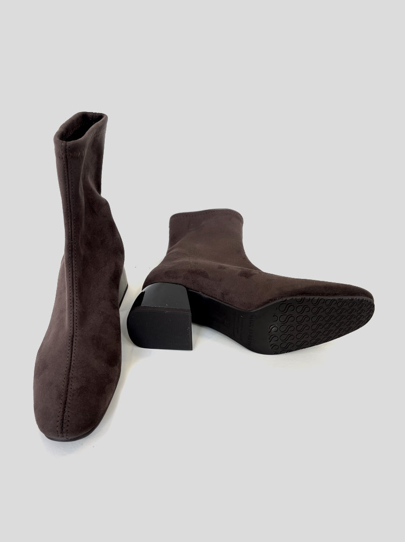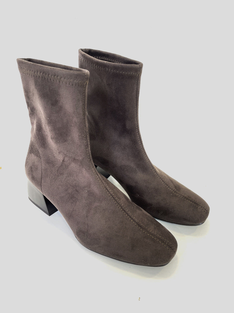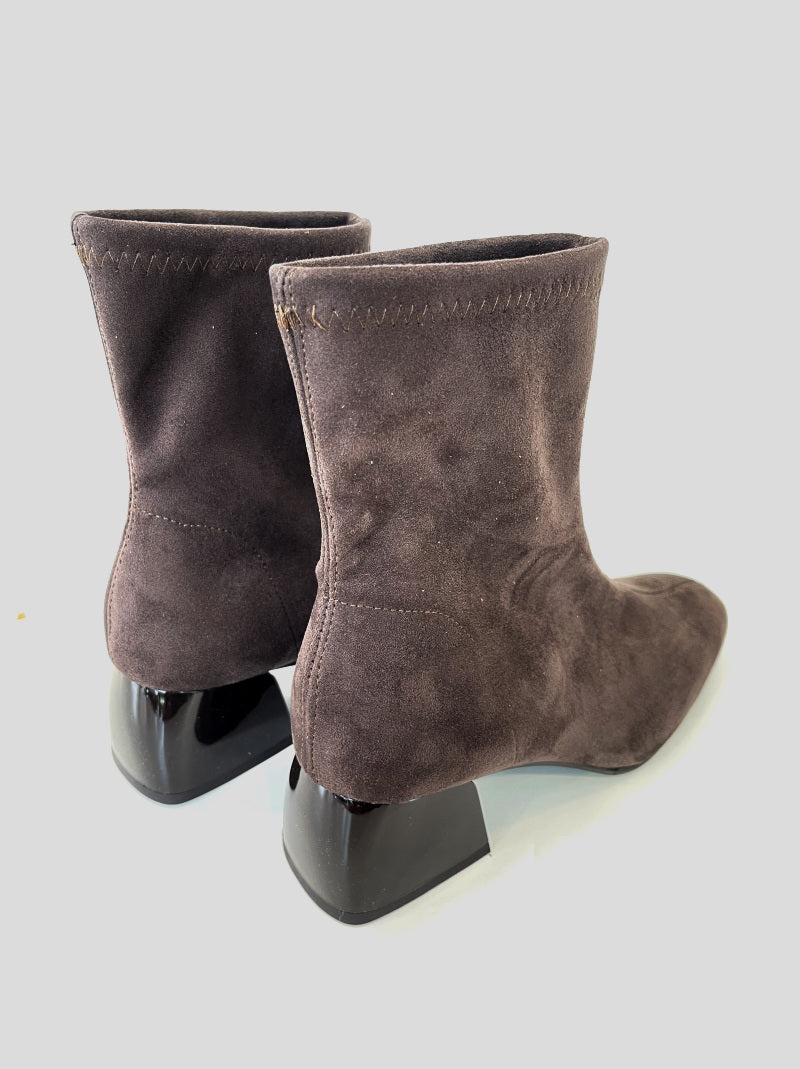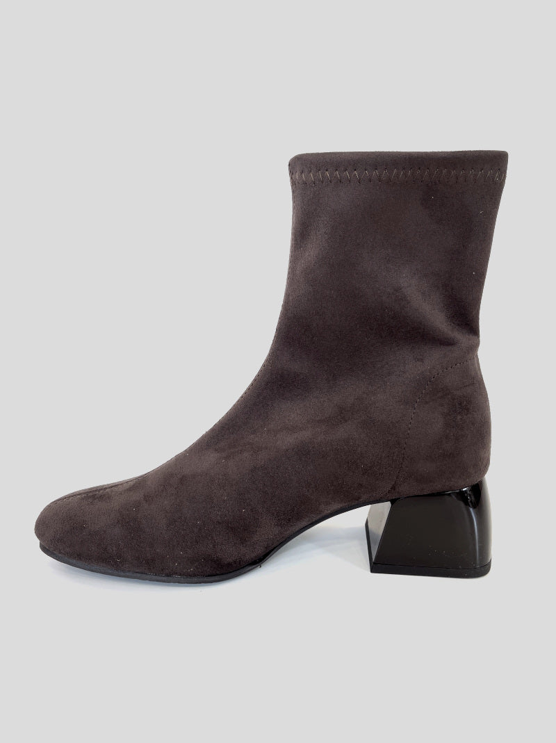 Botín MISS ELASTIC fabricado en ante strech ECO-ELÁSTICO e impermeable ECO-DRY color MARRÓN. Puntera cuadrada.Tacón ovalado de casco brillante de 5 cm. Plantilla y forro Biogel SANI TEX: transpirable, antibacteriana y resistente al mal olor.Suela de goma.