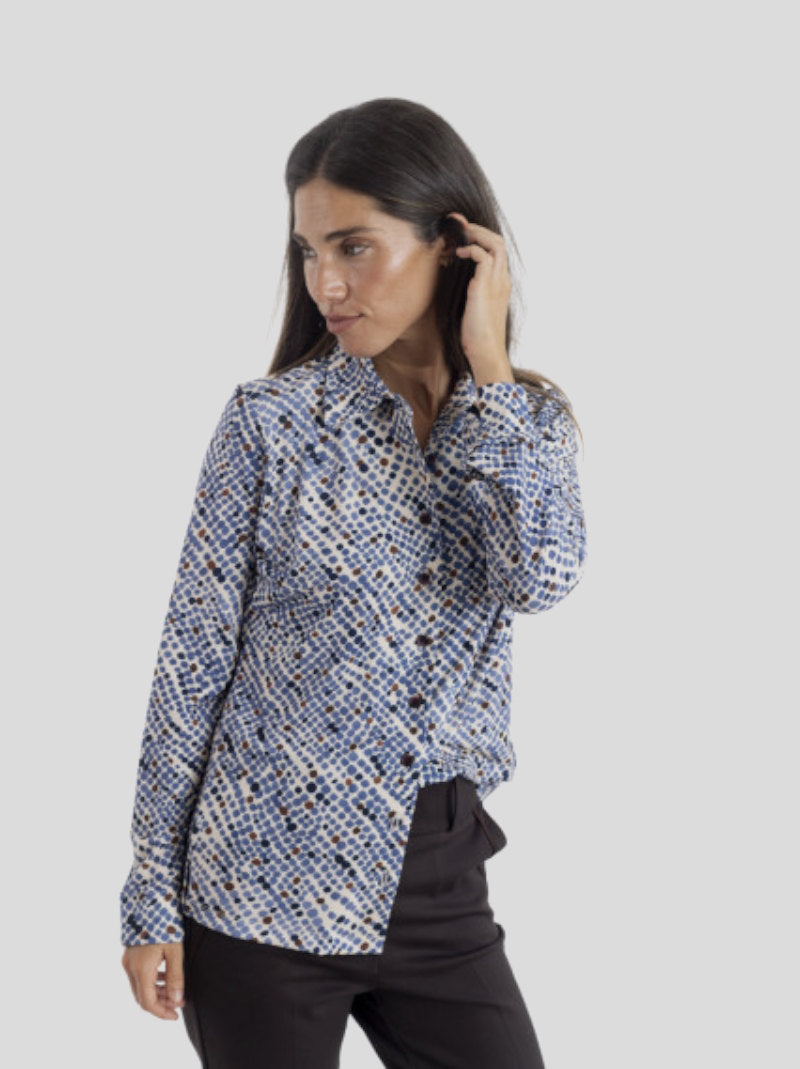 Camisa estampada BMB & Co confeccionada en tejido de punto elástico super agradable. Corte ligeramente evasé. Cuello camisero. Estampado lunares. Aberturas en la manga y laterales. Espalda adelantada. Cierre mediante botonadura central.