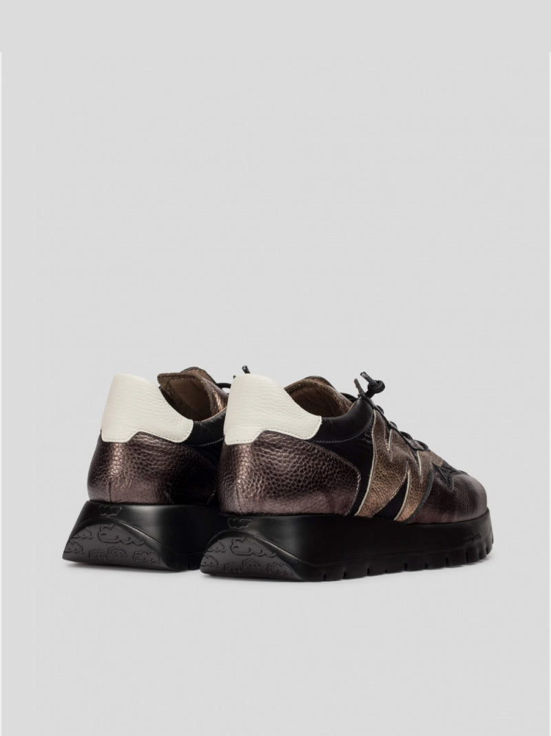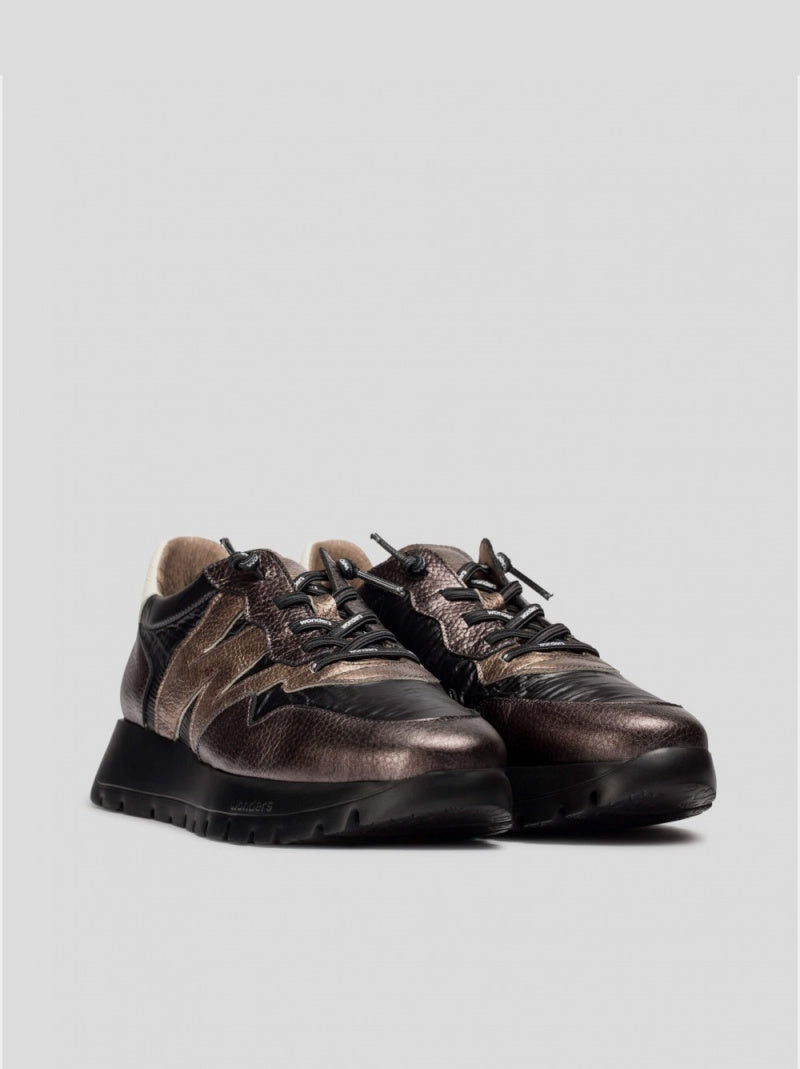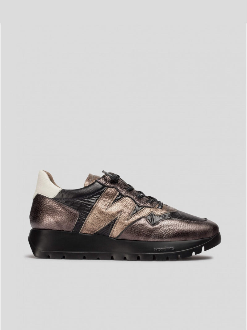 Deportiva WONDERS de piel grabada y nylon en tono NEGRO, ORO y COBRE. Modelo urban con detalle de logo lateral y cierre mediante cordones elásticos brandeados. Plantilla interna extraible MemoryGel que amotigua tu pisada. Suela desarrollada con WondersFly