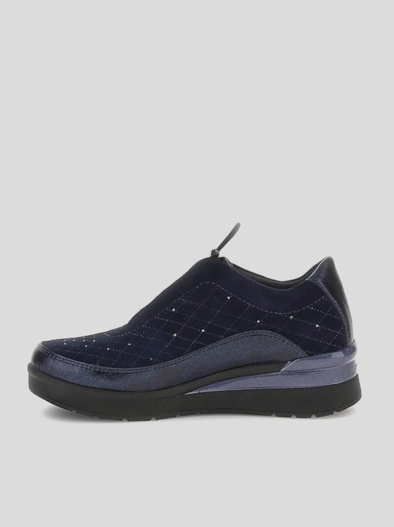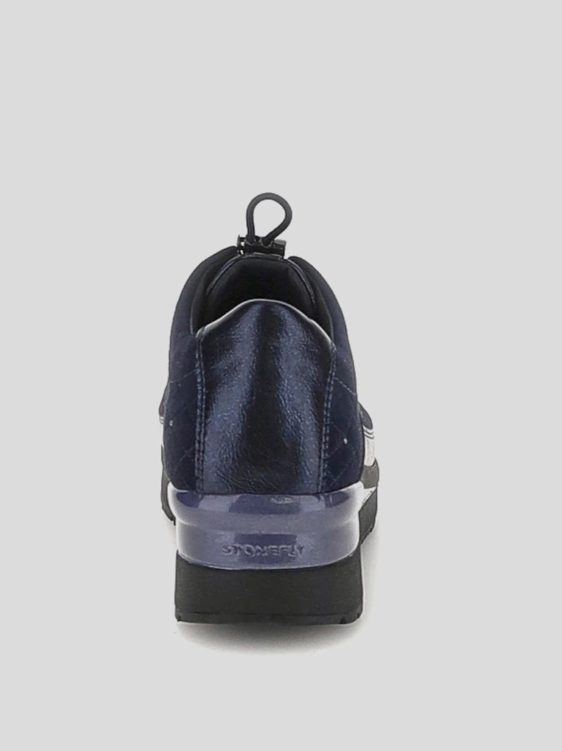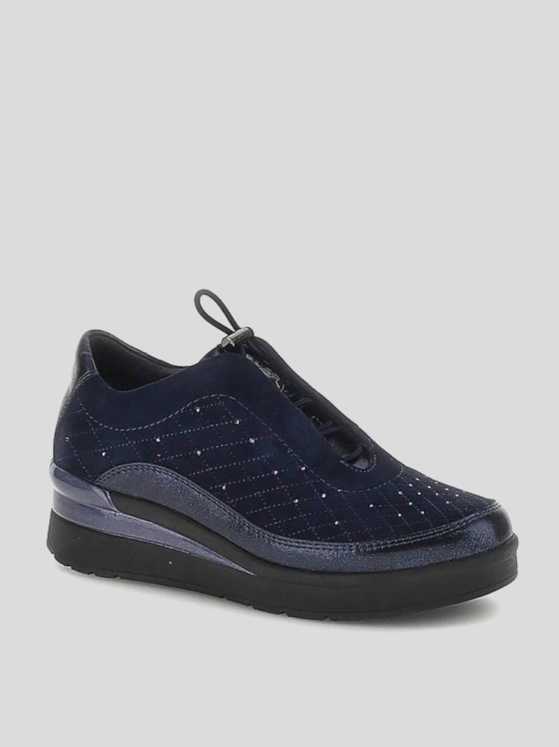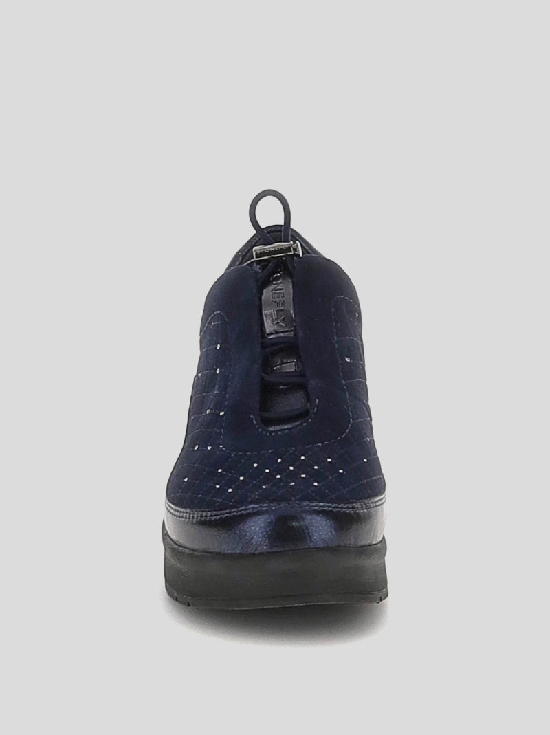 Zapatos de cordones elásticos ajustables STONEFLY en ante MARINO combinado con detalles en cuero sintético laminado y decorado con bordados y strass. CUÑA con piso muy ligero con sistema Blue Soft de gel en la suela. Plantilla extraible clima control.