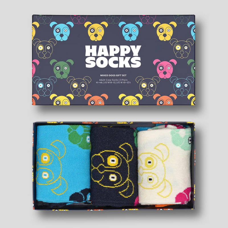 Caja de calcetines HAPPY SOCKS de algodón peinado modelo MIXED DOG GIFT SET 3-PACK. Esta caja incluye tres modelos de calcetines para los amantes de los perros en NEGRO, CELESTE y CRUDO. Tu mejor amigo caminará contigo... ¡GUAU...!