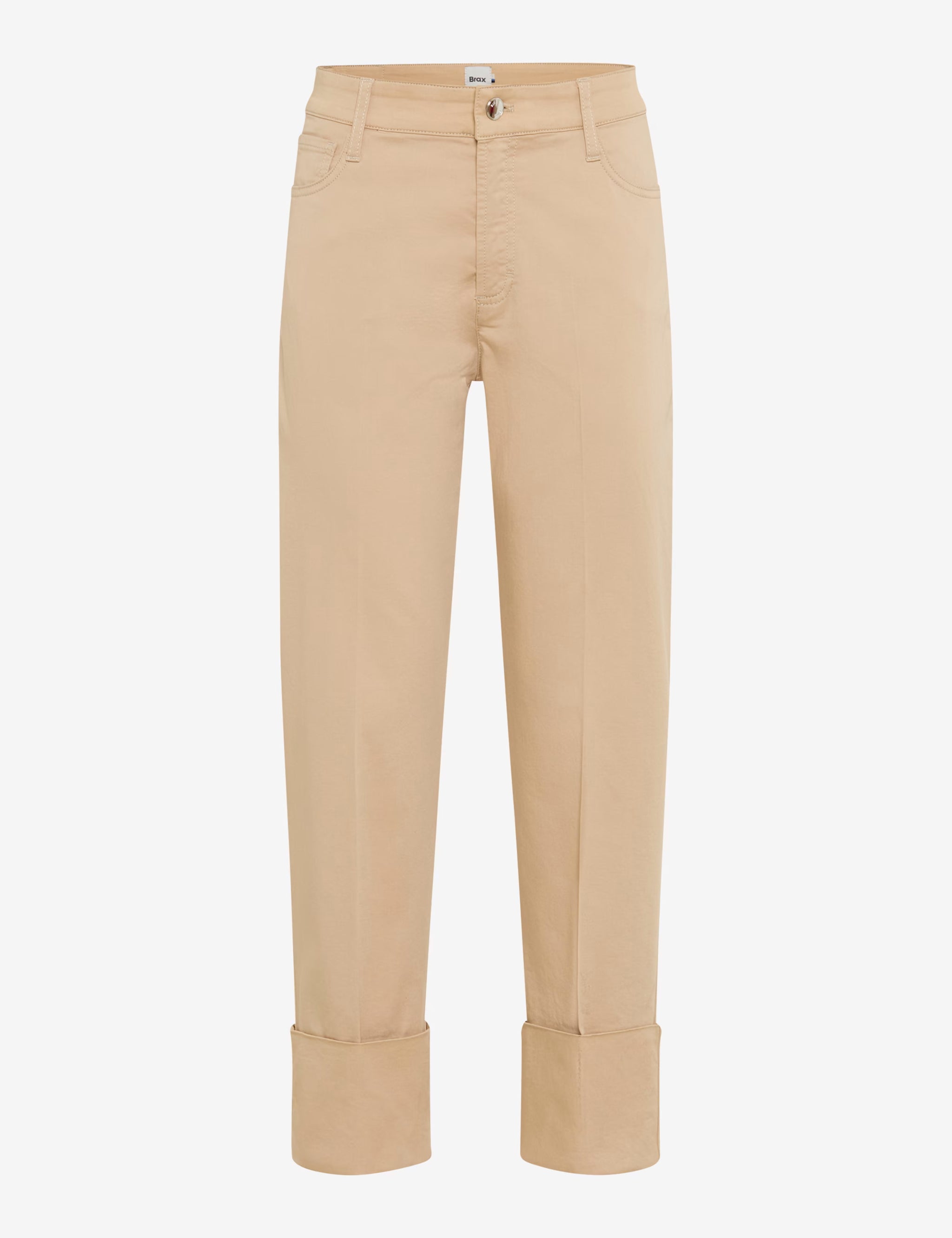 Pantalón BRAX FEEL GOOD modelo MADISON en tejido estilo satén mezcla de algodón elástico y Lyocell en color BEIGE. Corte recto con tiro alto y pierna con amplio dobladillo en vuelta. Lleva 5 bolsillos.Trabillas en cintura. Cierre por botón y cremallera.