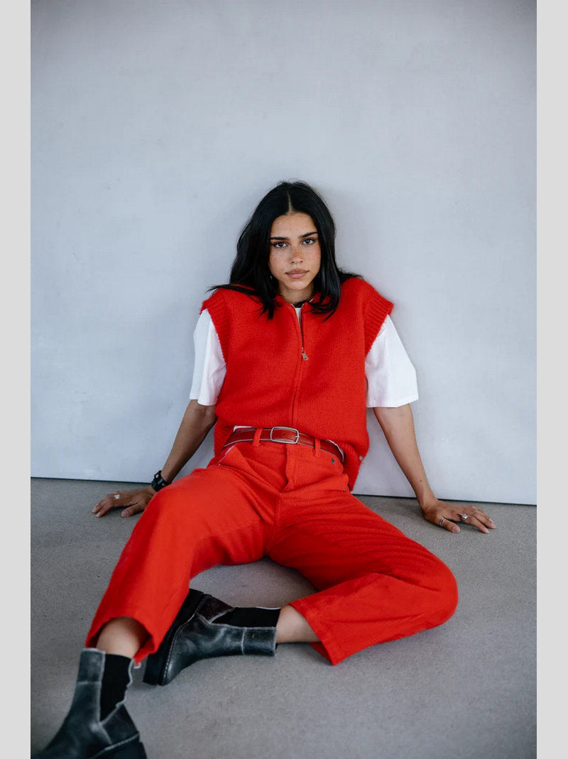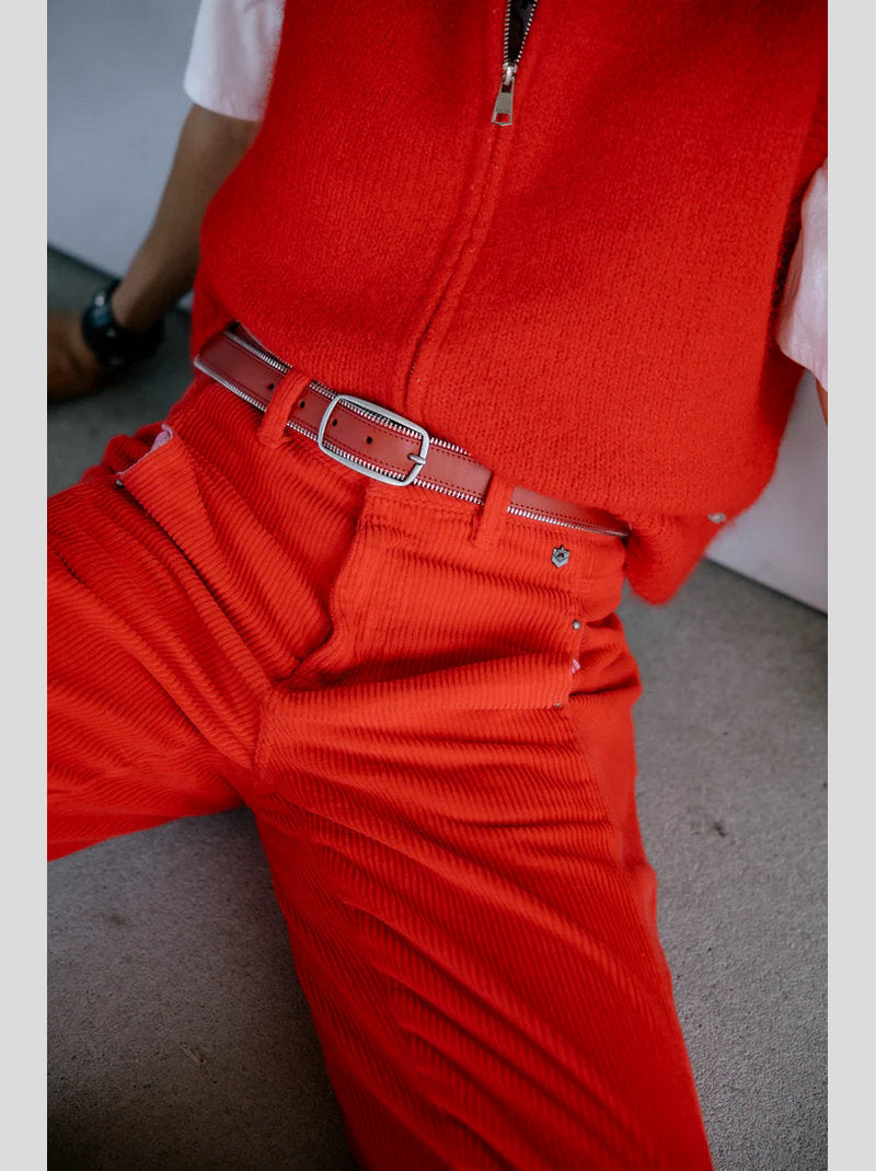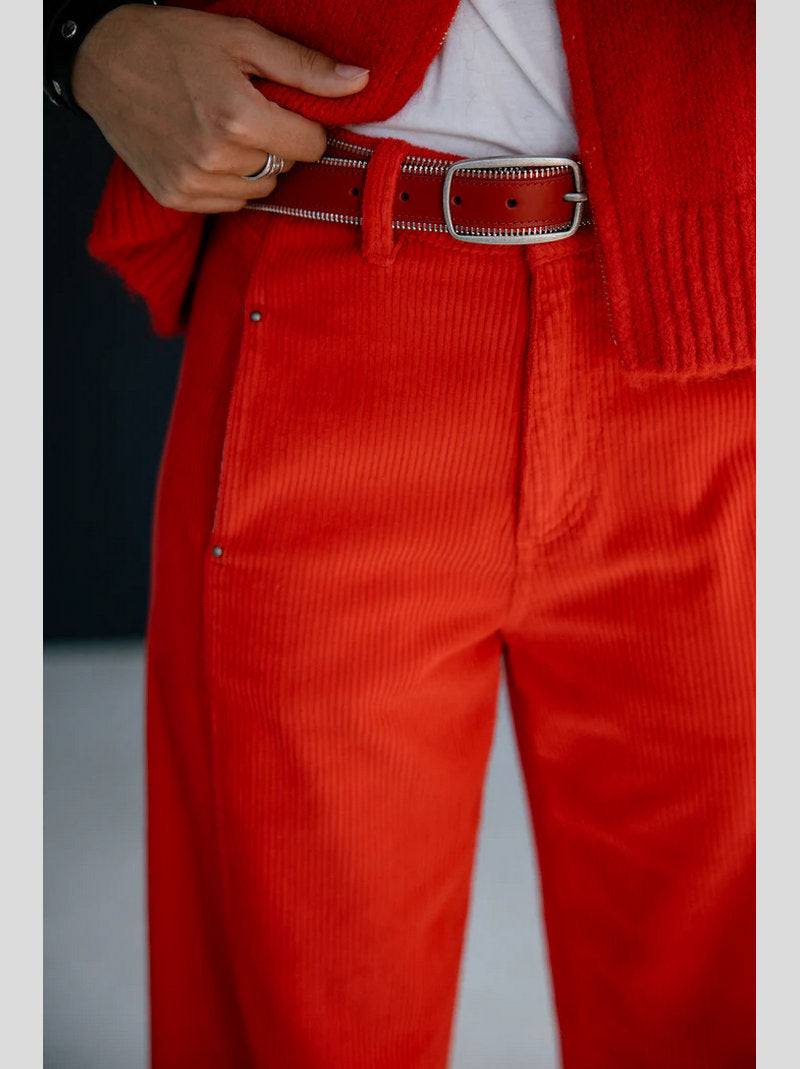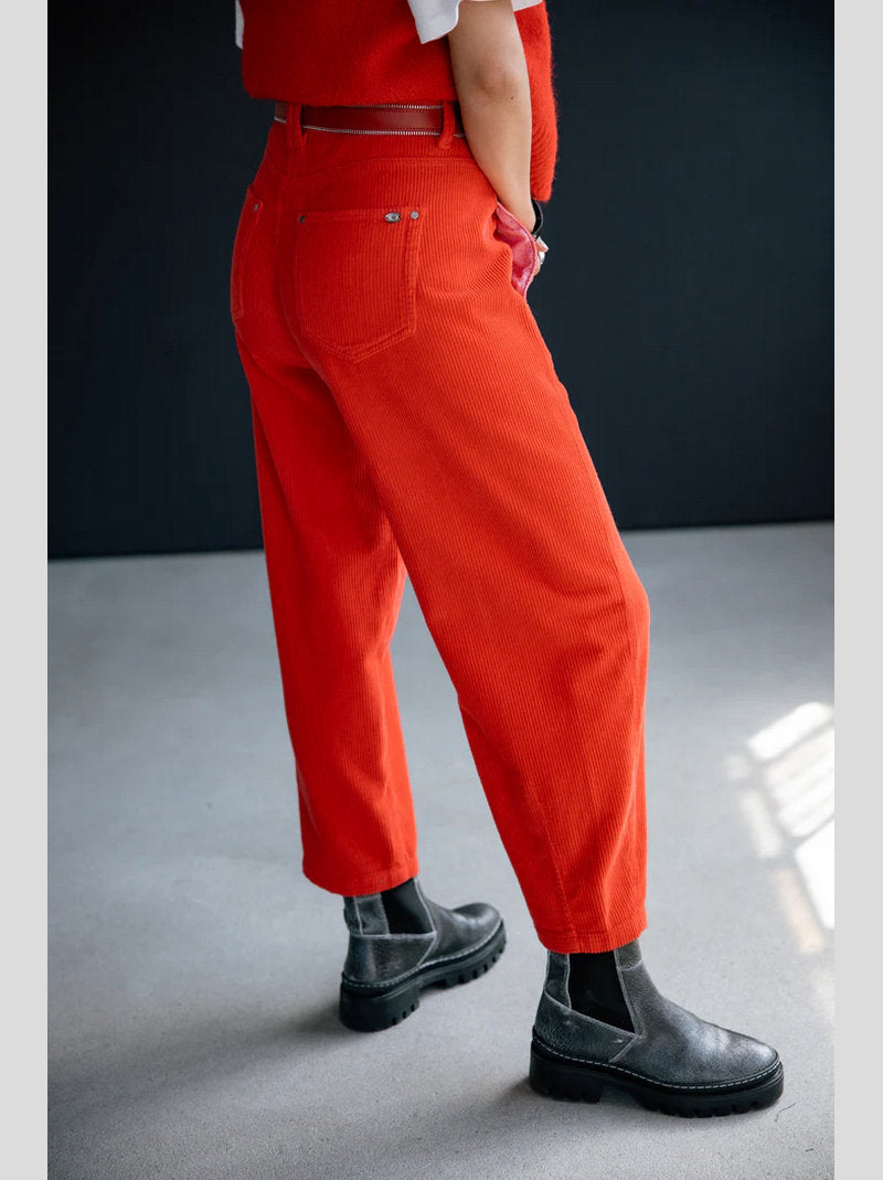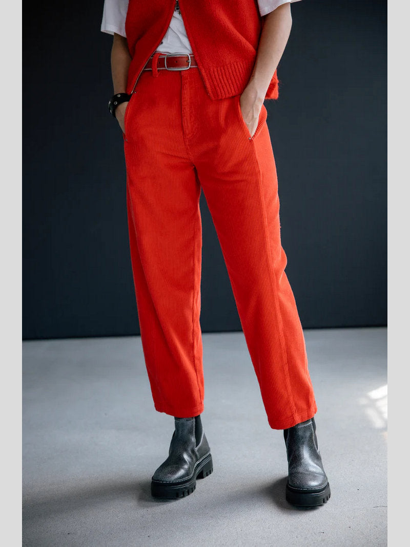 Pantalón ROSALIA de FREEMAN T.PORTER confeccionado en pana color ROJO. Piernas abullonadas. Largo 7/8 (tobillero). Cintura alta. Costura lateral decorativa con bolsillo interior. Pinza en la parte trasera de la pernera. Pana ancha y elástica.