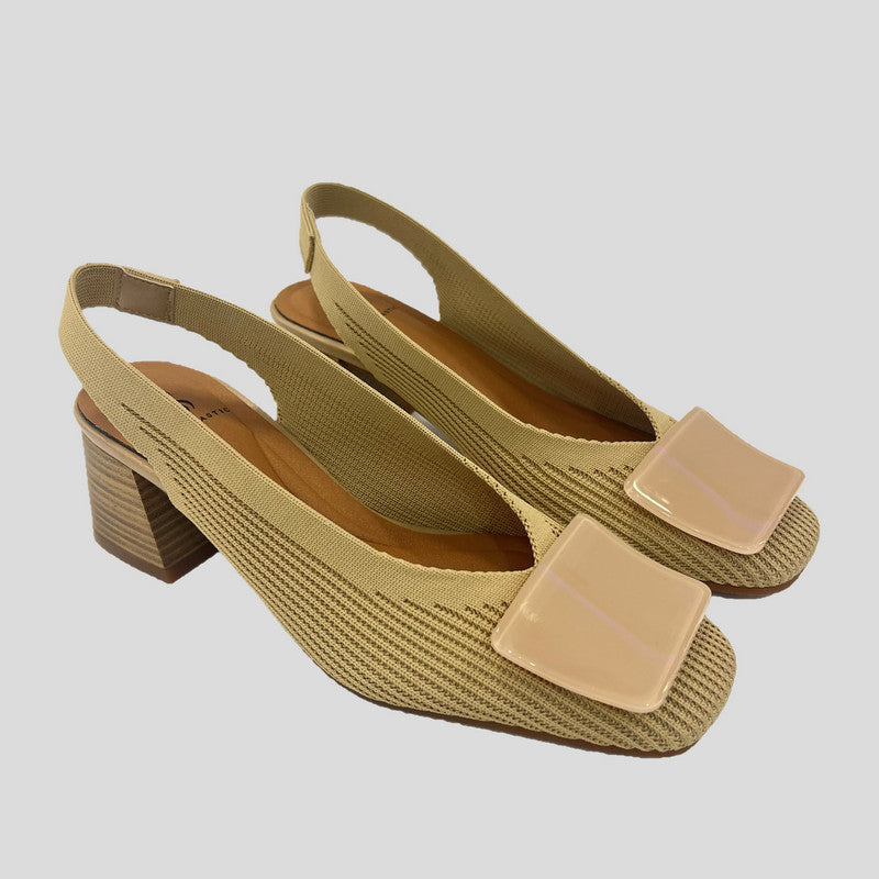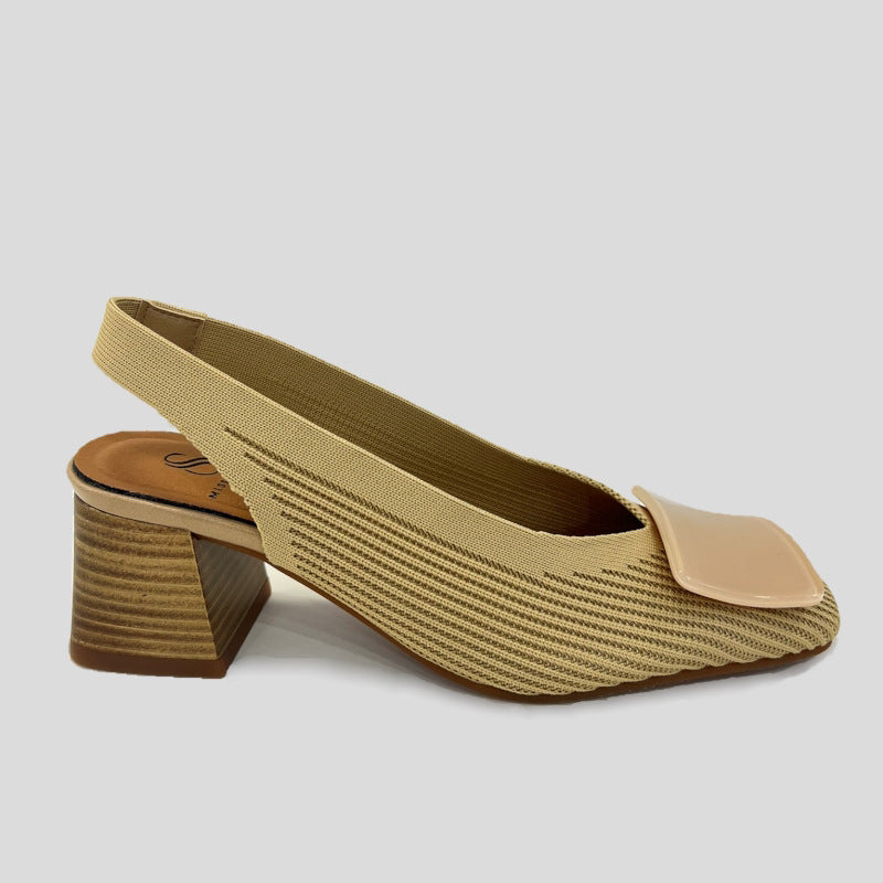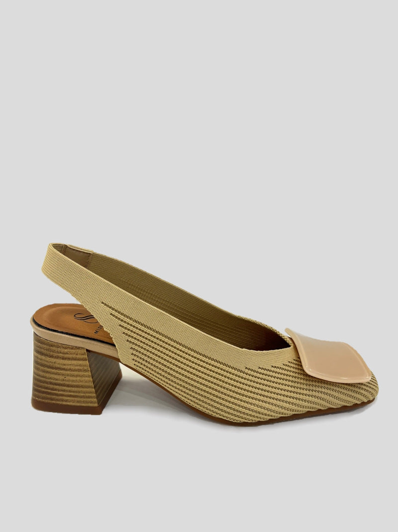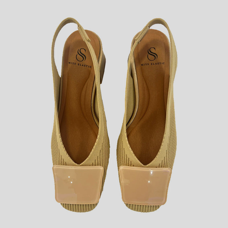 Salón destalonado MISS ELASTIC en tejido reciclado pet ECO-ELÁSTICO ajustable al pie. Punta cuadrada con adorno al tono en la pala, tacón cuadrado de 5,5 cm. Plantilla Biogel SANI TEX: transpirable, antibacteriana y resistente al mal olor. Suela de goma.