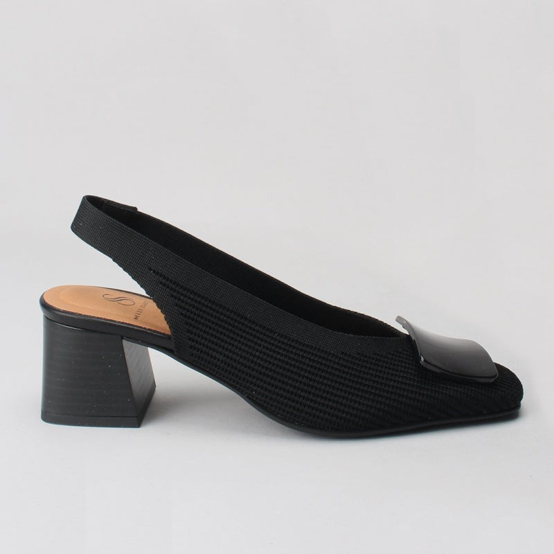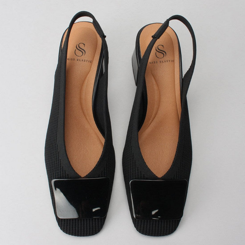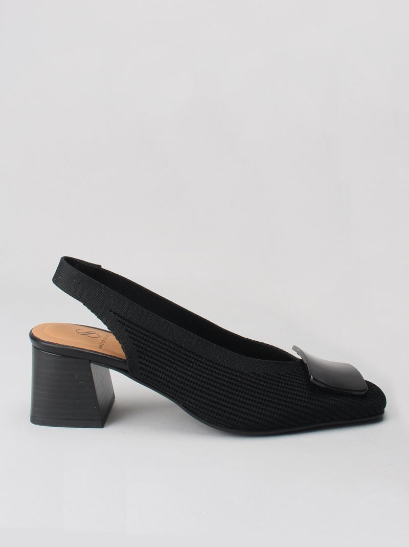 Salón destalonado MISS ELASTIC en tejido reciclado pet ECO-ELÁSTICO ajustable al pie. Punta cuadrada con adorno al tono en la pala, tacón cuadrado de 5,5 cm. Plantilla Biogel SANI TEX: transpirable, antibacteriana y resistente al mal olor. Suela de goma
