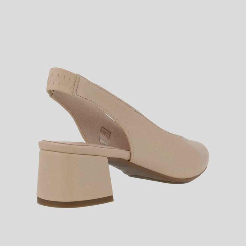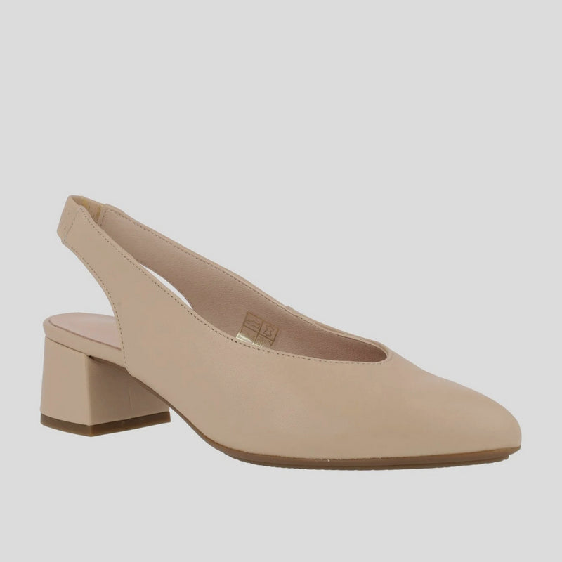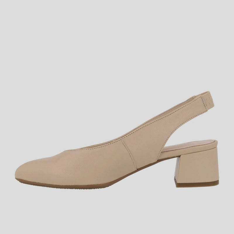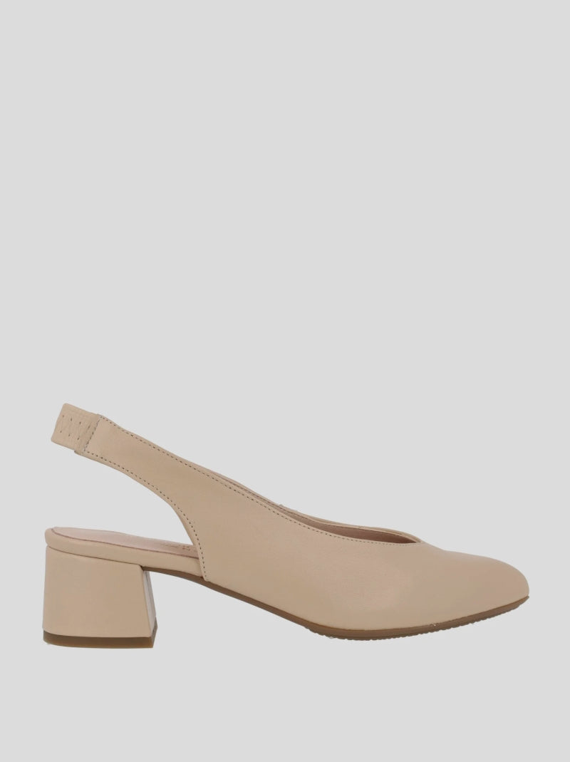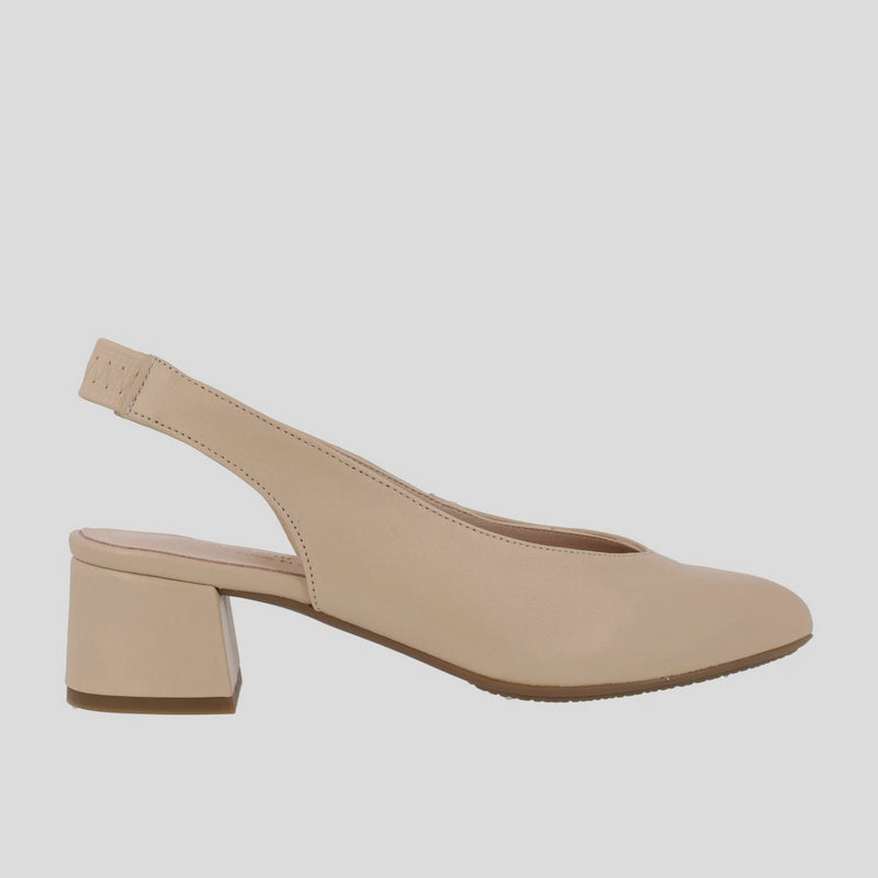 Salón destalonado NE.KA.NE fabricado en piel lisa color BEIGE con plantilla interior de piel acolchada y suela de goma antideslizante. Lleva tacón medio de 5 cm forrado en piel al tono. Acabado en punta con tira de talón con ajuste elástico al tono.