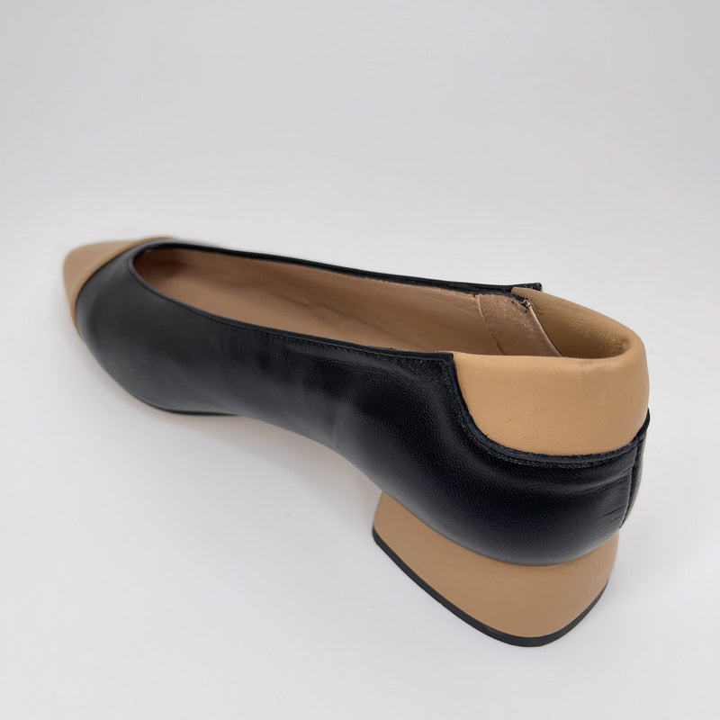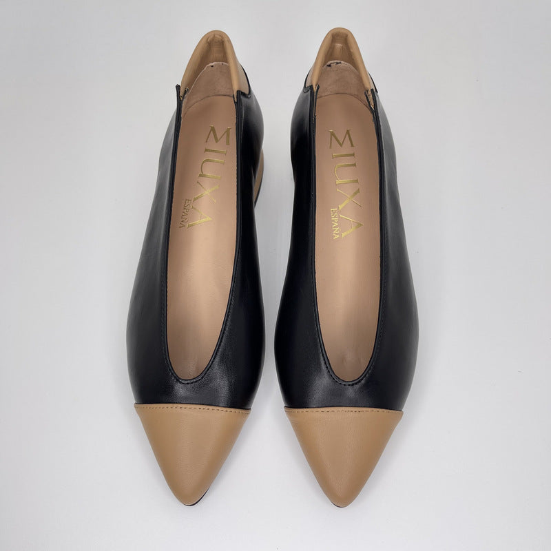 Salón de MIUXA en piel suave color NEGRO con detalle de punta y talón en piel ALMENDRA. Forro interior en piel. Plantilla en piel acolchada. Tacón de 3,5 cm, forrado en piel color almendra. Suela antideslizante. Fabricada artesanalmente en España.