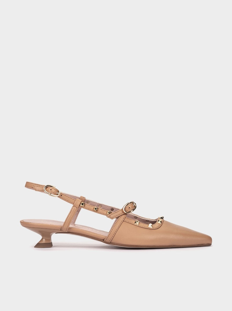 Salón destalonado PEDRO MIRALLES en piel lisa color CAMEL con tacón en forma de copa y puntera afilada. Detalle de tachas en metalería dorada. Hebillas con elástico: una en el tobillo y otra estilo merceditas en la pala. Plantilla de piel. Suela de caucho