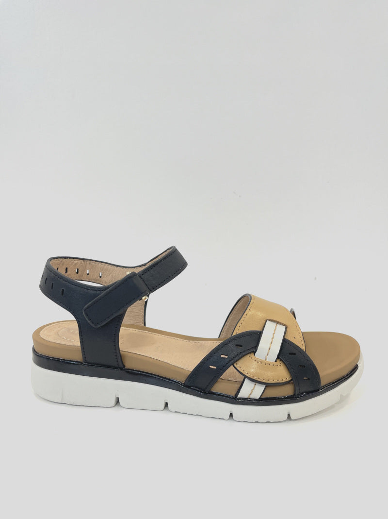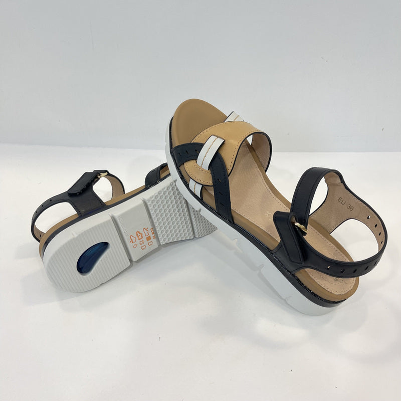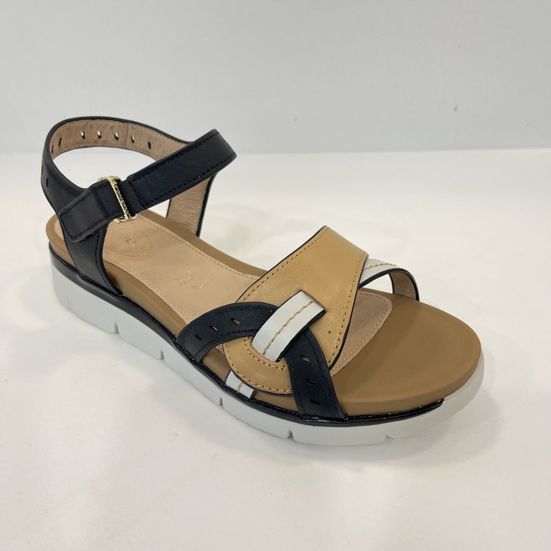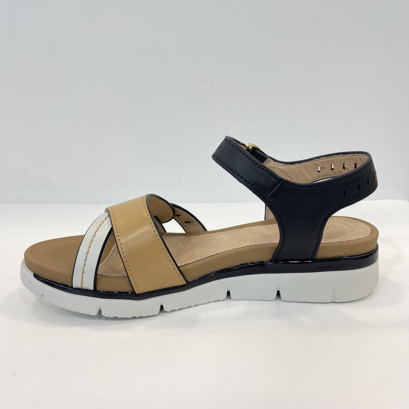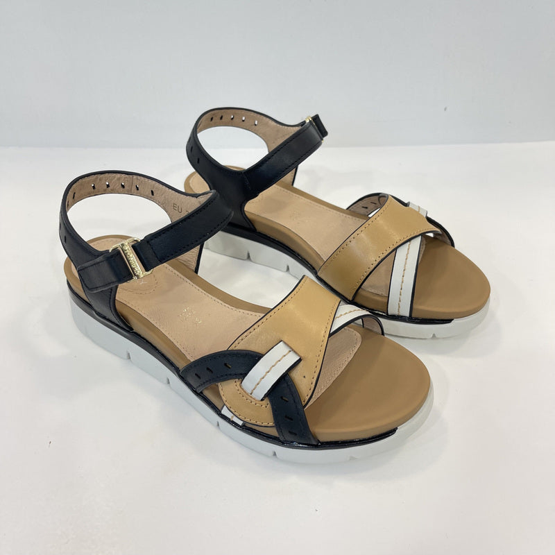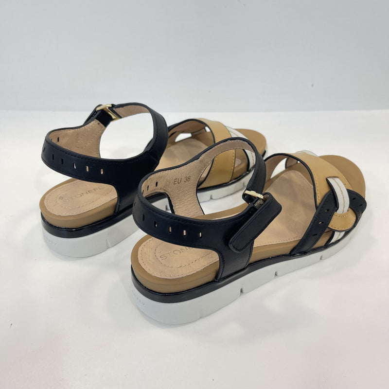 Sandalia de mujer STONEFLY de cuña baja en piel napa combinando tiras en colores NEGRO, BEIGE y CAMEL. Tira de tobillo con ajuste por velcro y tiras delanteras con un original diseño entrelazado. Suela de goma con tecnología Blusoft® en almohadilla de gel
