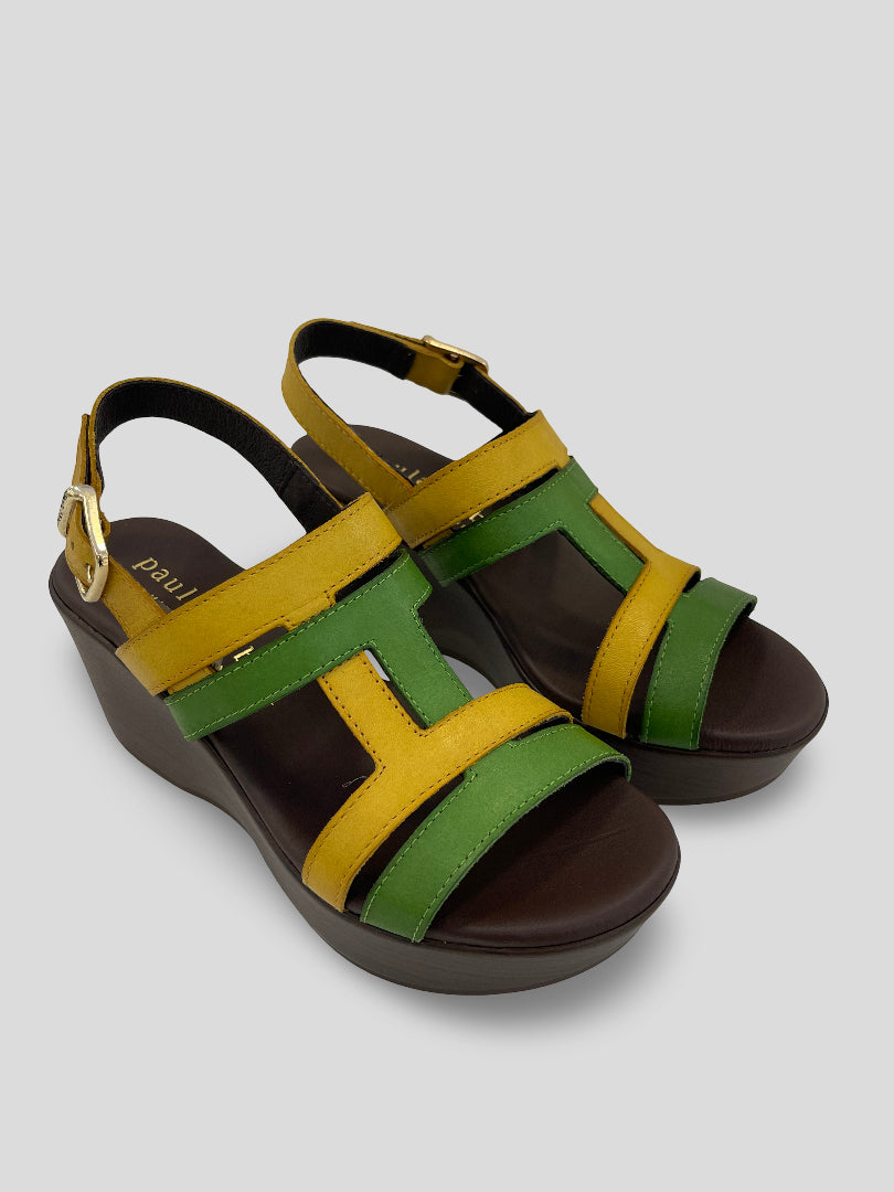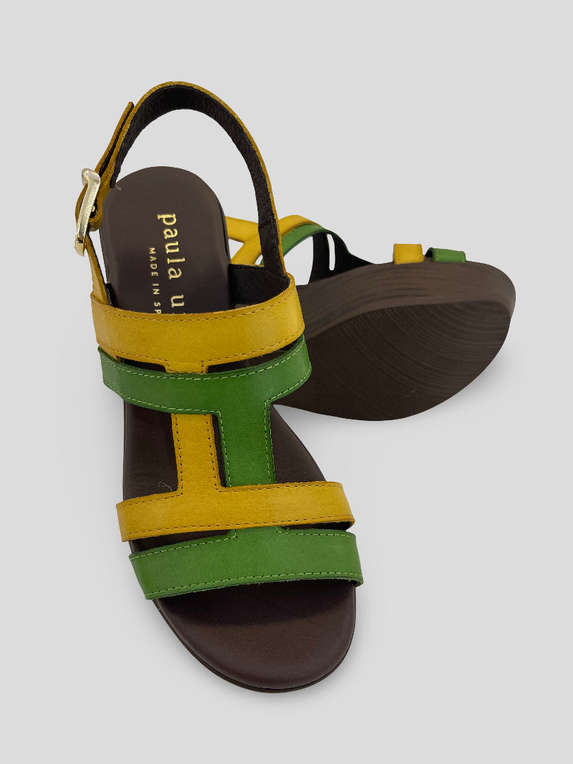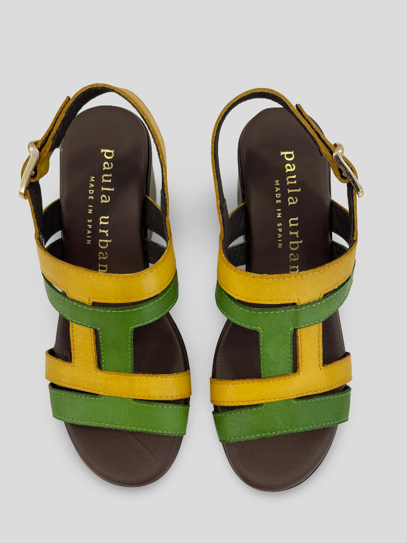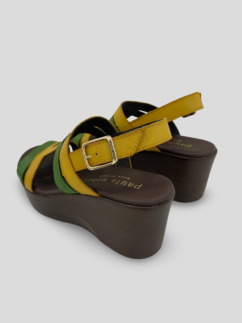 Sandalia de PAULA URBAN de PLATAFORMA con CUÑA MEDIA que combina tiras en piel VERDE y AMARILLO entrelazadas en H. Tira de talón con ajuste por hebilla. Plantilla piel acolchada con exclusivo sistema interior FLOT-UP SYSTEM que otorga excelente comodidad.