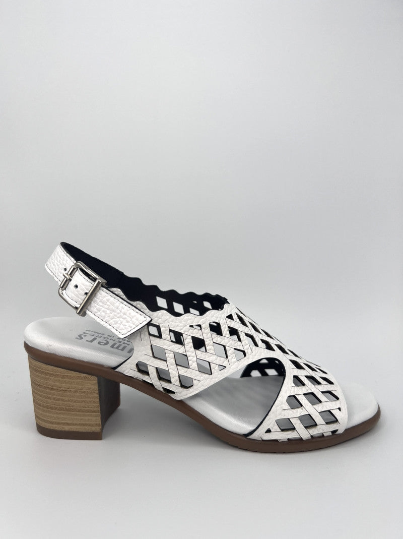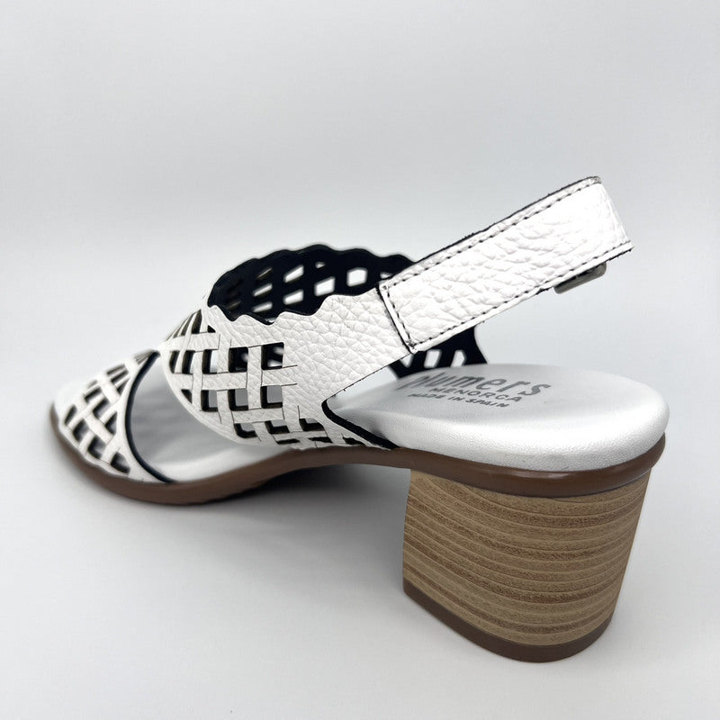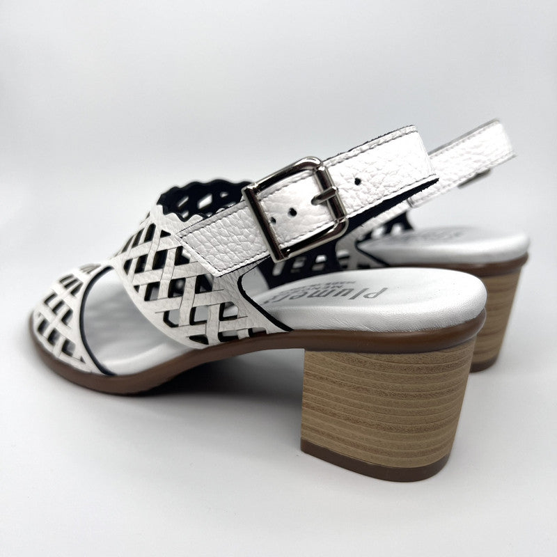 Sandalia con tacón medio de PLUMERS en piel grabada color BLANCO. Diseño de pala completamente troquelada y tira trasera con ajuste por hebilla. Plantilla de piel acolchada al tono. Tacón semiredondo de 6 cm efecto madera. Suela de goma antideslizante.