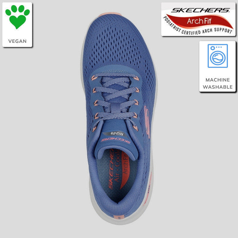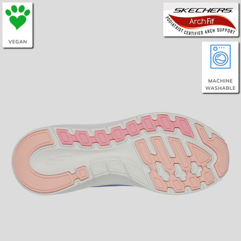 Deportiva vegana de Mujer SKECHERS ARCH FIT modelo 2.0 - BIG LEAGUE en tejido técnico color AZUL con ROSA. Sistema de plantilla Arch Fit CON SOPORTE EN EL ARCO PLANTAR CERTIFICADO POR PODÓLOGOS. Plantilla confort EXTRAÍBLE diseñada para mayor comodidad.