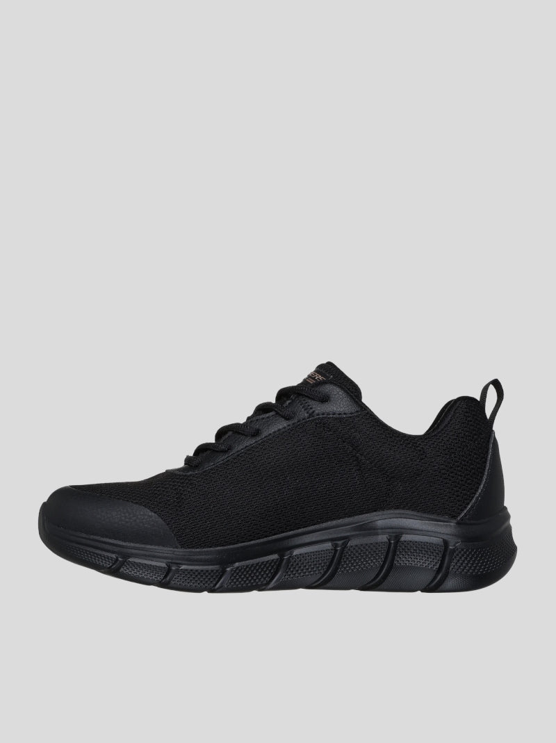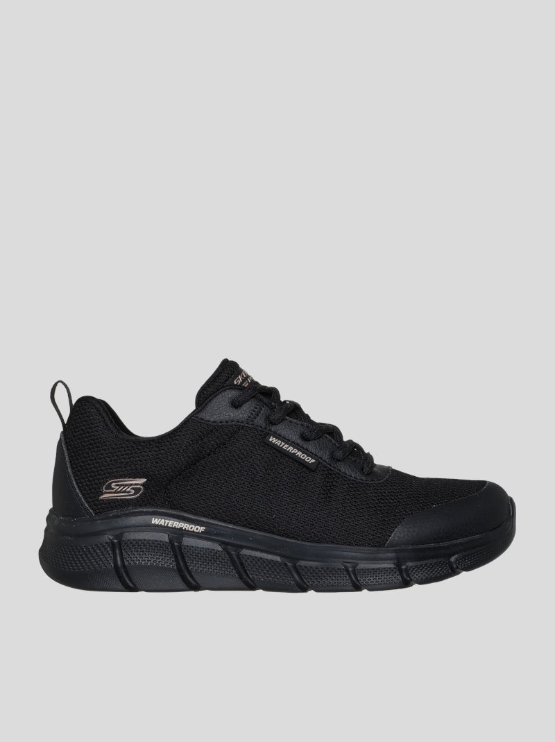 Deportiva impermeable de Mujer SKECHERS modelo BOBS SPORT™ B Flex - Flex Proof color NEGRO. Fabricada en tejido de malla vegano WATERPROOF con costuras selladas. Ajuste por cordones. Plantilla Skechers Memory Foam y suela de goma flexible con tracción.