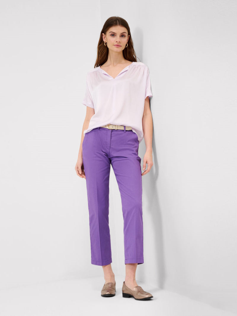 Top de BRAX FEEL GOOD modelo CAELEN fabricado en combinación de texturas color LILA. Frontal en viscosa con textura en brillo tipo seda y espalda en mezcla de viscosa elástica. Cuello SERAFIN, redondo con escote en V y manga corta con fruncido en hombros.