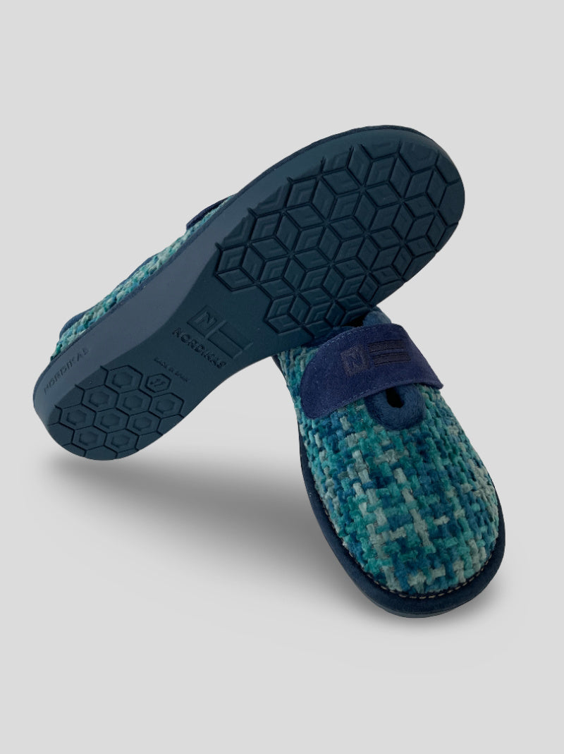 Zapatillas de casa NORDIKAS de mujer modelo TOP LINE 7396/4 QUEBEC color TURQUESA. Ajuste por velcro, cerradas por detrás. Tejido trenzado efecto jaspeado y aterciopelado para una mayor calidez. Suela de goma antideslizante y aislante del frío. Cuña 3cm.
