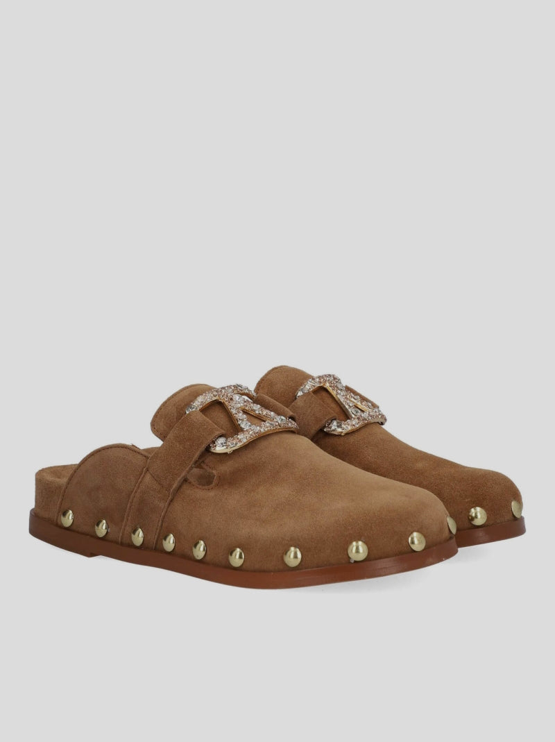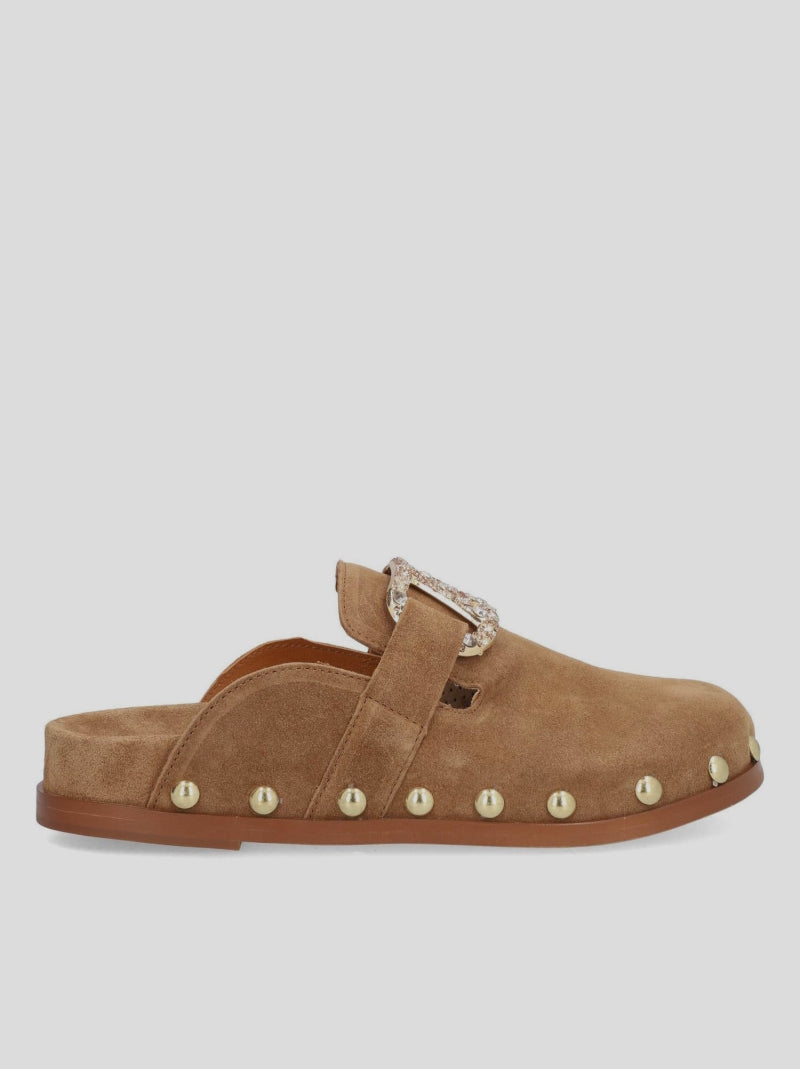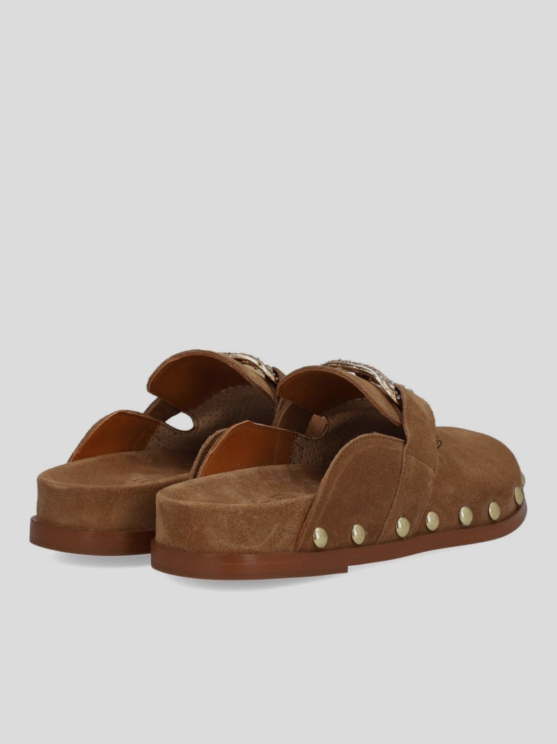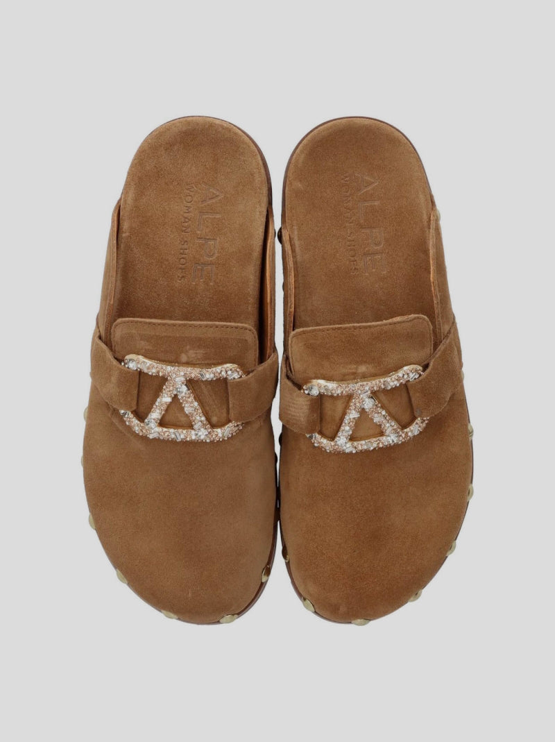 Zueco ALIVE de ALPE en ante color CUERO. Diseño estilo mocasín con plantilla tipo BIOS. Antifaz con detalle de pedrería en la pala y tachas redondas doradas a lo largo del lateral. Lleva suela de goma entideslizante.